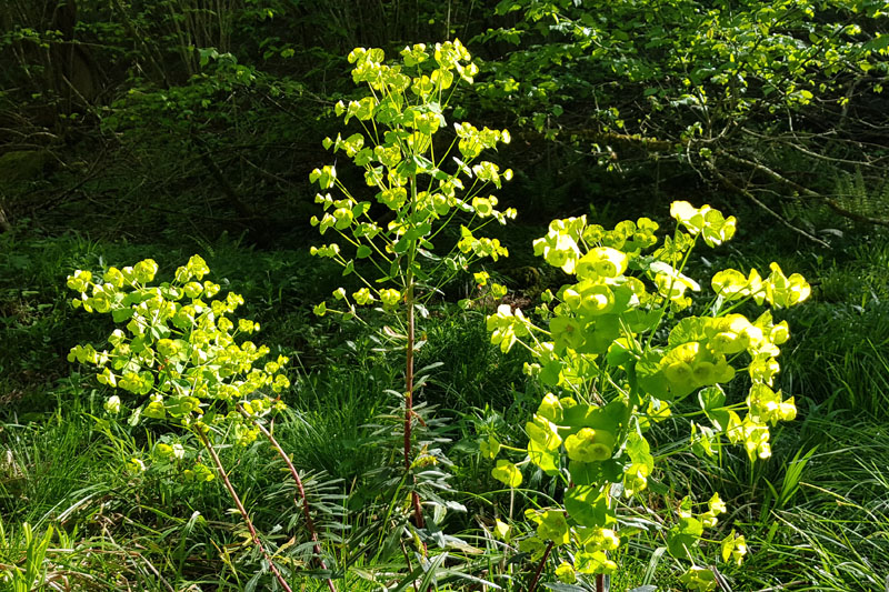 Wood Spurge. Illuminated by a shaft of sunlight piercing the morning mist