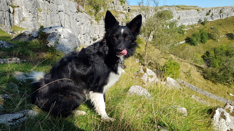 Halfway up the steps leading to the limestone pavement above Malham Cove. Four legs is definitely an advantage 🙂