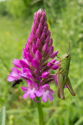 Pyramid Orchid and Meadow Grasshopper